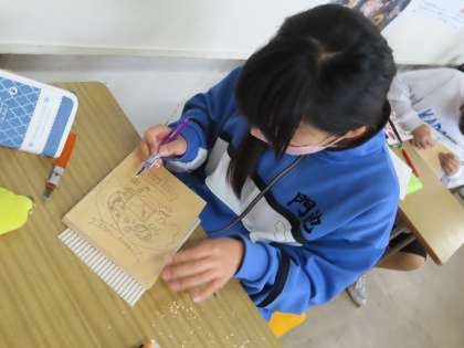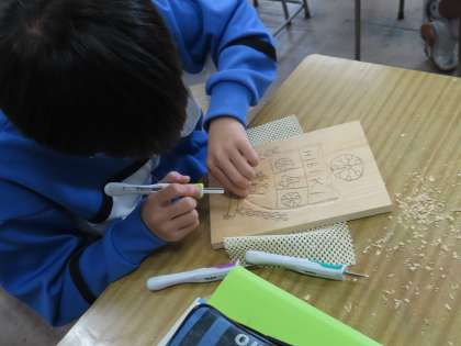 ドアプレートを作っています。彫刻刀を正しく、安全に使って彫り込んでいきます。
