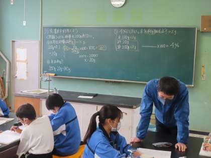 「濃度を利用しよう」の問題に取り組んでいます。一人学習の時間ですので先生がヘルプに入っていきます。