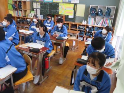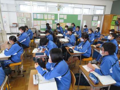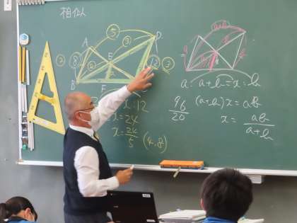 3年生の数学です。相似についての学習です。時田先生の説明に「難しい」「うーーん」と言う声が漏れてきます。頑張れ3年生!