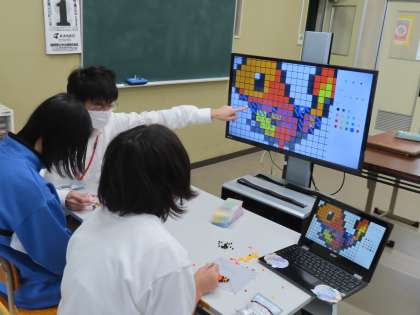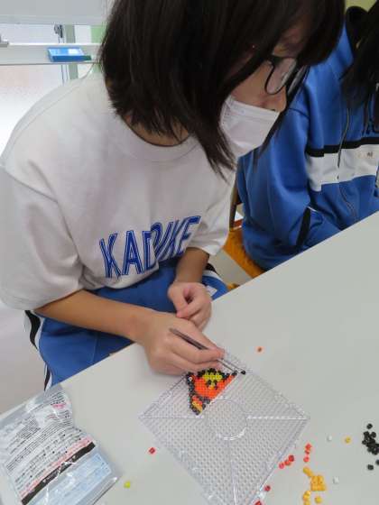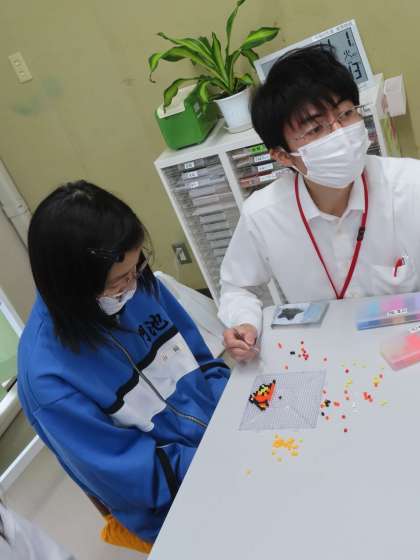 2人で選んだ作品を作成しています。画面の様にピンセットで材料をつかみ、はめていきます。集中が必要な作業となっています。
