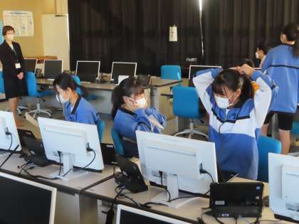 会議室・3C横更衣室・パソコン室の3カ所を使い、7名ずつのテストを行います。chromebookのmeetを使い7名のALTと会話形式のテストです。