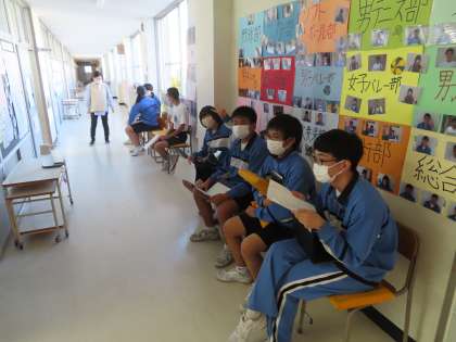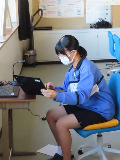 会議室・3C横更衣室・パソコン室の3カ所を使い、7名ずつのテストを行います。chromebookのmeetを使い7名のALTと会話形式のテストです。