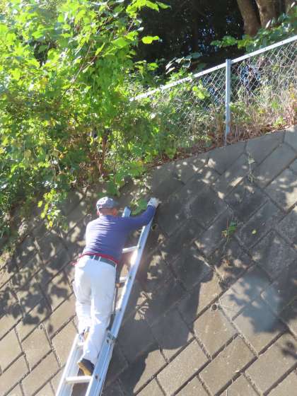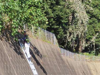 学校東側の斜面から道路にせり出している雑草を刈り取ってくれています。高く、斜面になっているため危険で手をつけずにいたのですが、管理課さんが作業を行ってくれました。