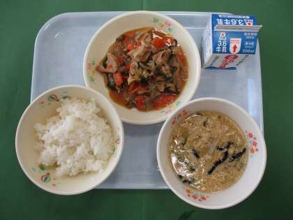 ごはん 牛乳 スタミナ焼肉 中華卵スープ 本日もおいしくいただきました。