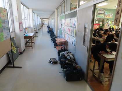 いつもの通り、廊下にはきれいにかばんなどが並べてあります。余計な物が見えない、整然と並んでいる。素晴らしい状況です。
