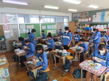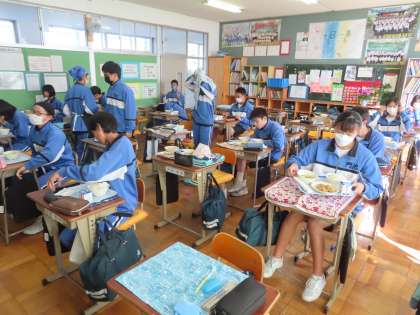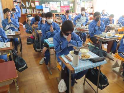 静かな食事風景でした。たくさん食べたい生徒は配膳台に行きおかずやごはんをもらっています。
