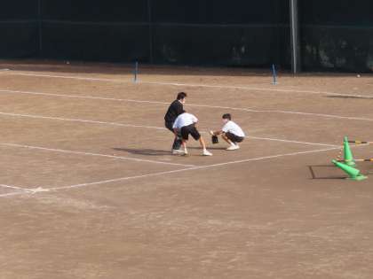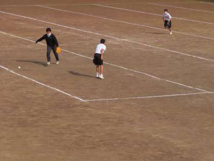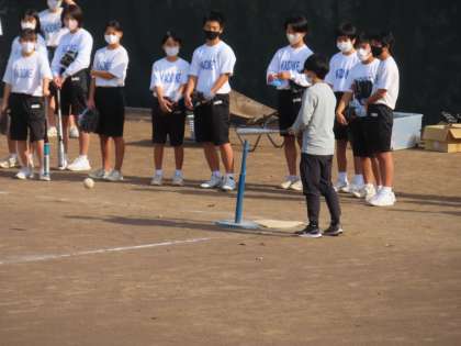 Tポールを使ったゲームをしていました。吉田先生も入って守備をしていました。打った人のボールを守備全員で追っかけ、キャッチしたら全員で座る。それまで打った人はベースを回ります。ベースを踏んだ数が点数となります。