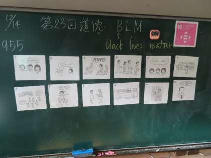 芹澤先生の道徳です。BLMについての授業です。BLACK LIVES MATTERの略です。主にアメリカでの差別について学んでいます。日本人にはなかなか理解できない歴史などからおこっている差別です。たくさんの事件を丁寧に説明をしてくれました。