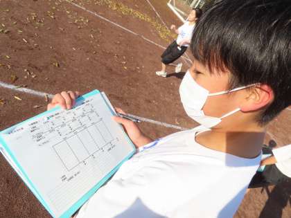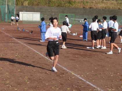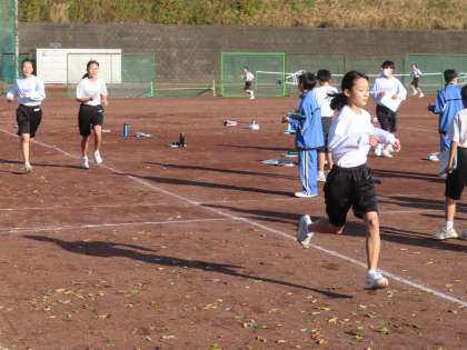 1Cの体育は長距離走です。ちょうど男子が走り終わって女子がスタートしたところです。1周ごとのタイムをペアが記録していきます。
