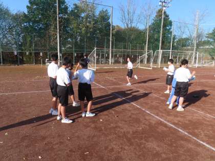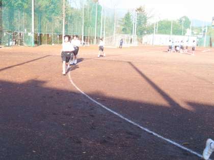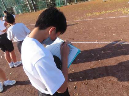走り終わった生徒は自分の脈拍を測ります。どのくらいの強度があったかを確認します。男子は1500m、女子は1000mを走るそうです。記録をとる生徒が「あと2周」などと応援していました。