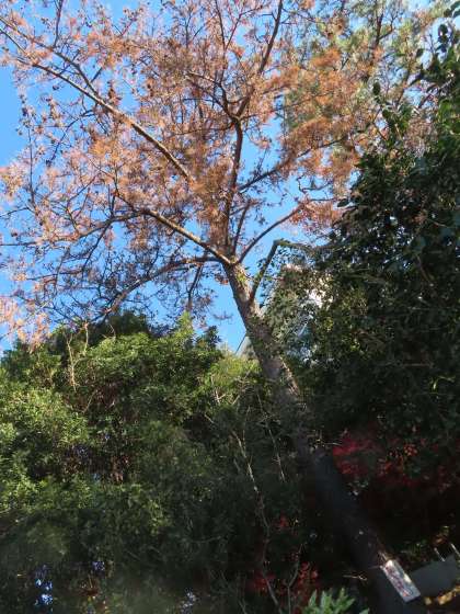 門池の森の中の「松」が2本、全体が茶色に枯れてしまっていました。倒木の心配があった為、市の管理課にお願いしました。すぐに業者が来てくれ2本を伐採してくれました。