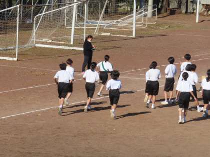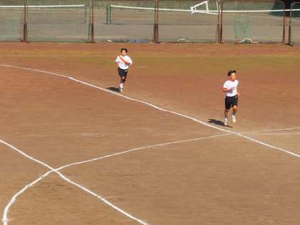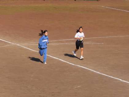 チームメイトが並走しながら応援をしています。大きな声をかけて応援する生徒もいました。