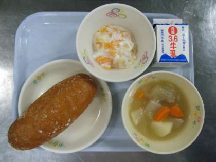 4月27日 今日の献立 公開日 2017/04/28 更新日 2017/04/28 健康・安全 【今日の献立】 ・揚げパン、ロールパン ・ポトフ ・ヨーグルトサラダ ・牛乳 今沢地区では、約4ヶ月ぶりのパンの献立でした。この4月より、バンデロールさんがパンを納品してくれています。久しぶりのパンの給食に生徒たちは喜んでいました。 いいね(0)