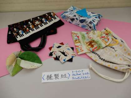 写真は左から「布で作る巾着やコースター」作りの作業風景と、その作品です。