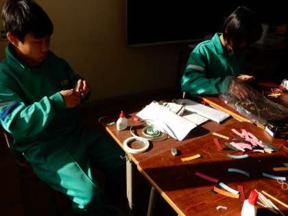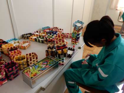 左から紙バンドを使って小物入れやコマの作製作業です。右はその作品です。