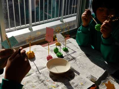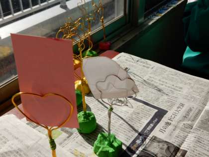 左からメッセージホルダー、フォトフレームの作製作業です。右はその作品です。