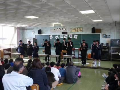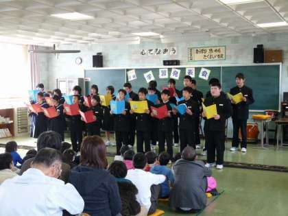 群読、太鼓演奏、ベル演奏に続き、ベルとトーンチャイムを合わせた演奏、合唱を行いました。