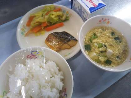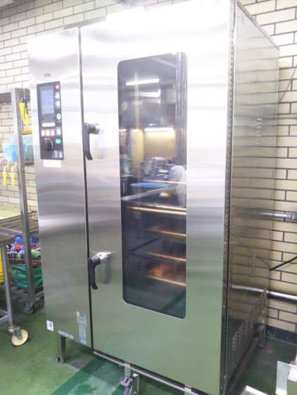 今日は、給食室のスチームコンベクションという機械で味噌煮を作りました。大量調理では、このような大きな機械を使って焼き物や蒸し物、煮物の調理をしています。