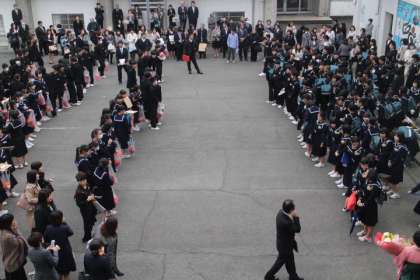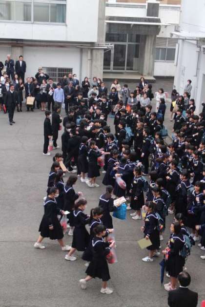 1・2年生から花を渡され、見送られています。