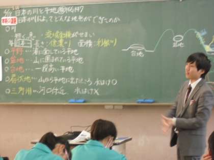 2年生は扇状地や三角州などの地形について学習していました。上流から土砂を落としていくときには重いものからという思考によって、扇状地には粗い目、三角州には細かな目の土砂が堆積することに気づきました。だから、扇状地には水はけがよくなり、果樹の栽培に適しているのですね。