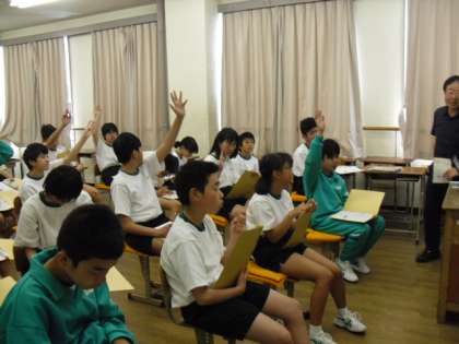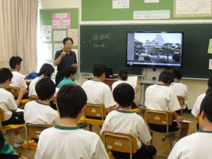 社会(D組)の授業を参観しました。今日の題材は、授業者が春休みに訪れた「姫路城」です。ボランティアガイドやパンフレットから学んだ情報を、クイズ形式で教えていました。城の中から敵に向けて鉄砲を撃つ「狭間」(はま)と呼ばれる仕組みや、姫の暮らす部屋と女中の暮らす部屋との違い等、興味深い問題が出されました。生徒の皆さんは意欲的に挙手をして、姫路城の内部について学びを深めていました。
