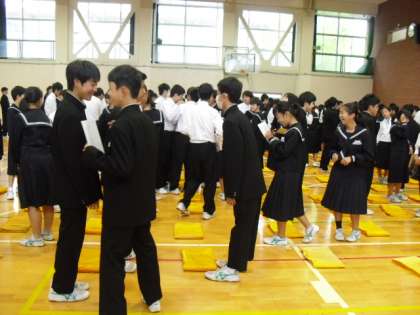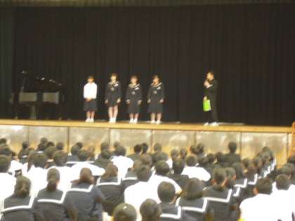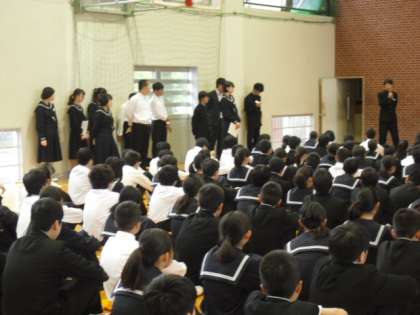 校歌斉唱の後、更衣準備期間にあたって制服の着こなしについて呼びかけを行い、各学級の生活委員が丁寧に服装点検をしました。これから暑くなりますので、衛生面も考えて着用してほしいと思います。