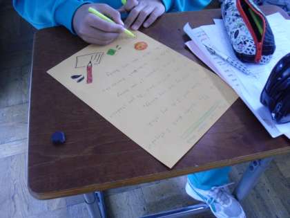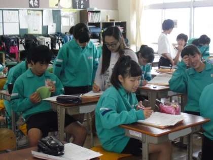 2年生の言語(英語)を参観しました。「連休中の思い出」をテーマに、レターづくりに取り組んでいました。過去形を文面の中に用いるために、既習事項を確認しながら真剣に書いていました。「I amではなくて、I・・・?」「playの過去形は?・・・そうするとwantは・・・?」と、丁寧に教えていくと、生徒の表情がゆるんでいきました。日本語の作文同様、「はじめ・なか・おわり」という文章構成も視野に入れる学習に、英語指導の可能性を感じました。
