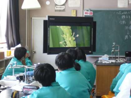 理科の授業を参観しました。「被子植物と裸子植物の受粉」についての学習でした。花びらを持っている普通の花には柱頭があるのに、「マツにはない!」「おかしいぞ?!、なぜだろう?」という声があがり、これまで扱ってきた植物の花の受粉と異なるケースのあることに気づきました。授業者は、教科書を実物投影機を用いて拡大投影したり、受粉の様子を映像(動画)で見せたりするなど工夫することで、イメージ化を容易にし、生徒の興味関心を高めていました。
