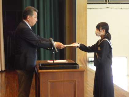 春の大会で入賞した団体(サッカー)と個人(剣道・卓球)に対して、朝礼の際に全校生徒の前で表彰を行いました。おめでとうございます!