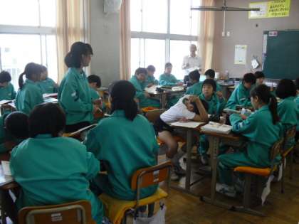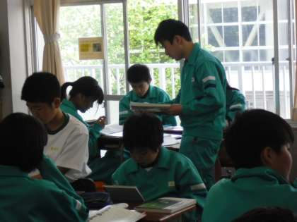 向田邦子さんの「字のない葉書」を読んで、「学習課題を決めよう」をテーマに学習していました。グループで相談した結果、「なぜ妹が書いた葉書のことを、年月がたっても気にしているのだろう」「妹の書いた○がだんだん小さくなっていった意味は?」「妹が帰ってきた時、裸足で飛び出していった父親の思いはどんなだろう」などの疑問が発表されました。これから、文章表現の一つ一つを追いながら、これらの疑問点を解決していってほしいと思います。