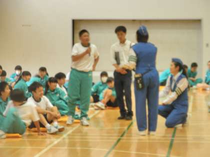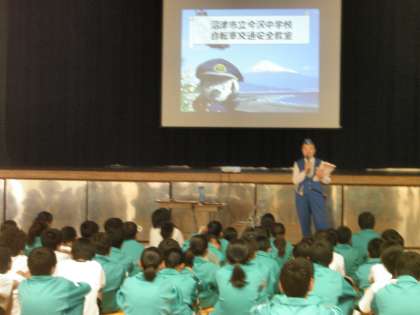 静岡県交通安全協会沼津地区支部から、交通指導員さん4人をお招きして、1年生対象に交通安全教室を開催しました。中学生の交通事故でいちばん多いのが「自転車」による事故だそうです。道路交通法の改正に伴い、路側帯の有無にかかわらず、自転車は必ず左側を通行することになっています。13歳になると歩道を走ることができません。(自転車歩道通行可の標識がある場合等は除きます。)帰りの会で、1年生には「中学生・高校生のための副読本 自転車セーフティ&マナー」という資料を配布しましたので、ご家庭でもご覧ください。