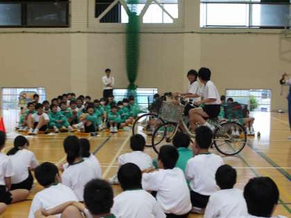 6時間目には、体育館で自転車の乗り方についての実地指導がありました。一時停止無視、並進走行、傘や携帯を持ちながらの運転、二人乗りなどの危険性について、車の立場、歩行者の立場、自転車の立場、第三者として等、視点を変えて考えることができました。工夫して指導にあたってくださった交通指導員の皆様、ありがとうございました。