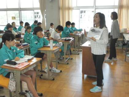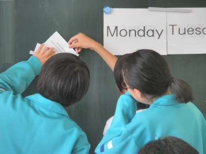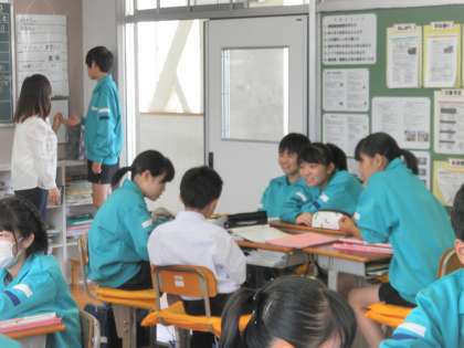 言語科「英語の時間」は、ALTとのティーム・ティーチングで行われています。今日は、ALTを派遣している会社の担当者と一緒に参観しました。ビートルズの「ハロー・グッバイ」をみんなで歌った後、天気を表す単語の発音を確認していきました。英単語の中にはスペルの中に発音しない部分がある場合のあることを学びました。後半はグループワークです。教室内に貼られているキャラクターカードの所まで行って紹介文を暗記し、班に戻ってワークシートに書いていくゲームでした。読むことと書くことの総合力が試される学習でしたが、生徒の皆さんは夢中になって取り組んでいました。