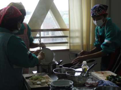 さあ、食材を切ります。役割分担を確認して、里芋・ごぼう・大根・ニンジン・こんにゃく・根深ネギを深鍋に入れ、けんちん汁を作ります。また、ベーコン・ほうれん草をフライパンで炒めます。どうか、おいしくできあがりますように。