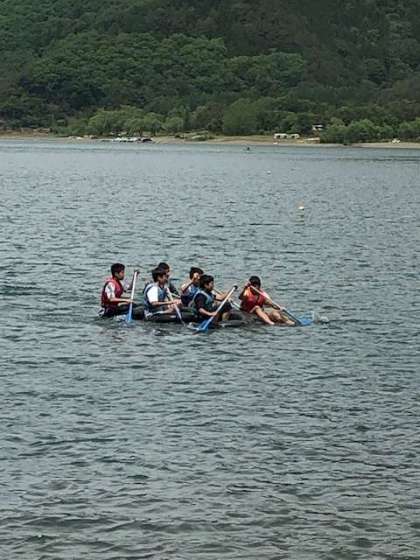 カヌー、いかだ作り、サンドブラスト、バードコール・サンキャッチャーを体験しています。