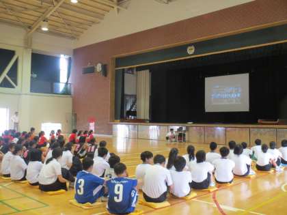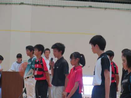 中体連市内大会の開幕を翌日に控え、6月28日(金)の6時間目に、体育館で恒例の「部活動激励会」を行いました。