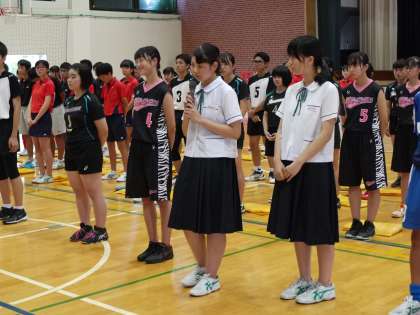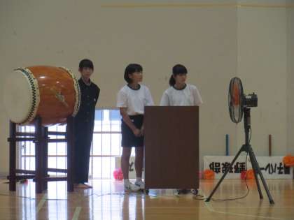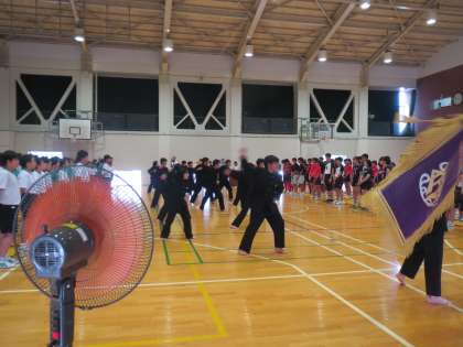 後半は、応援団が入場して、コンバットマーチに合わせて1・2年生全員でエールや校歌などを全力で3年生に送りました。暑さ対策として、大型扇風機をフル稼働(かどう)していましたが、応援団の太鼓や1・2年生の本気の声の方が扇風機のノイズを上回りました。