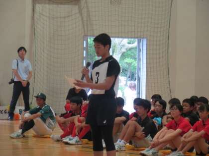 1・2年生の応援を受けて、最後に3年生を代表して男子バレー部の保科 匡吾さんが決意の言葉を述べてくれました。これまで支えてくれた方々に感謝の心をもち、自分たちの全力の姿を後輩たちに見せたい、と力強く述べてくれました。