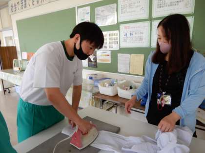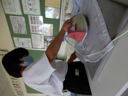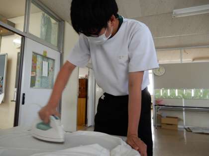 家庭科では、被服について勉強しています。今回は、ワイシャツのアイロンがけに挑戦しました。