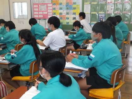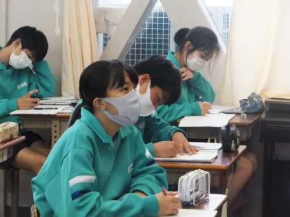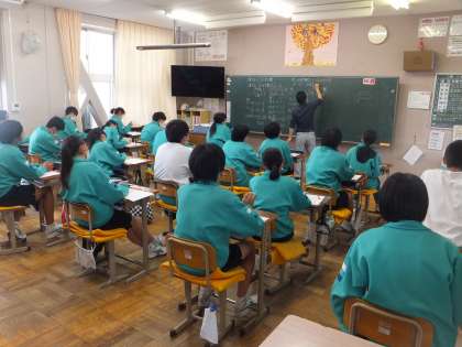 「平方根」の学習です。平方根の特徴についての説明を真剣に聞いています。
