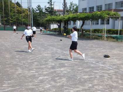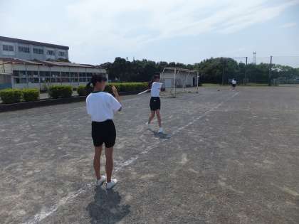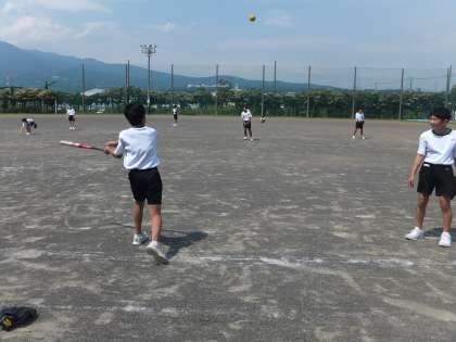 「ソフトボール」の授業です。近くからボールを投げてもらい、バッティング練習をしています。