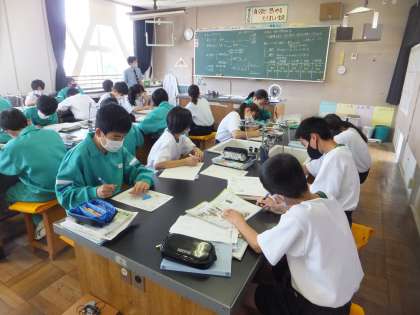明日から始まる期末テストに向けて、単元のまとめ問題を解きながら、大事なポイントなどを確認しています。