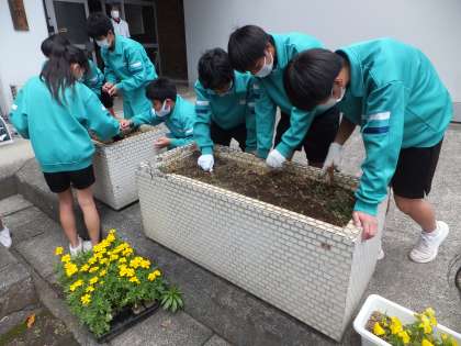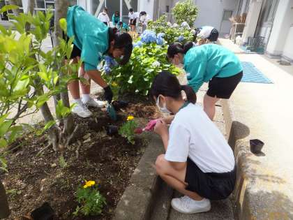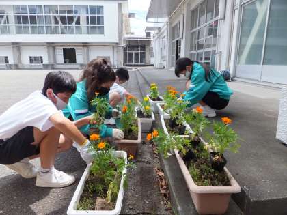 整美委員が協力して、花の植え替えを行いました。校舎まわりにある花壇に、色とりどりの花を植えました。整美委員は毎朝の花の水やりなど、日頃から学校環境美化活動に積極的にとりくんでいます。全員が気持ちよく過ごせる学校にしていきましょう!