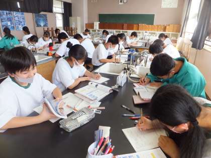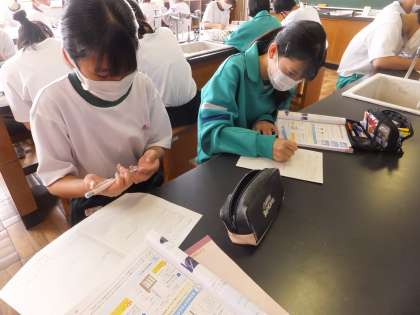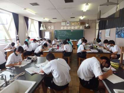 「熱を吸収する化学変化」の授業です。実験に向けて、どのような化学変化が起こるのかを予想しています。