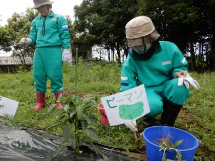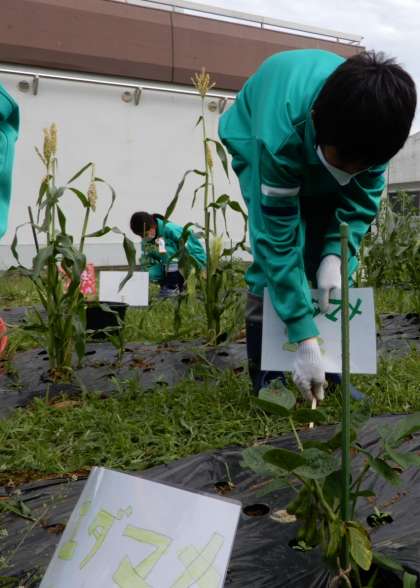 畑では、夏野菜のピーマン、枝豆、トマト、とうもろこしが大きくなってきました。