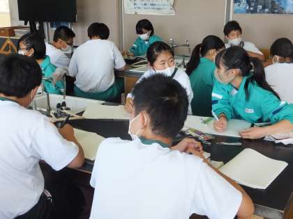 「なぜ物質を混ぜたら、質量は減ったのだろう?」という課題にとりくんでいます。実際に実験を見ながら、答えを予想しています。