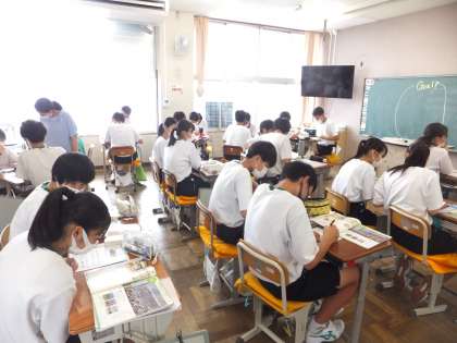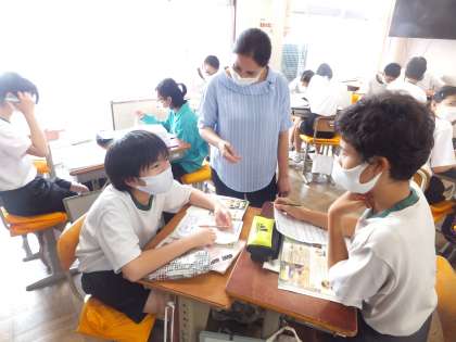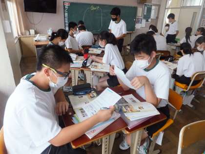 「レストランでの会話」の学習です。自分が注文したいものを考え、店員と客のやりとりの会話を自分たちで考えました。