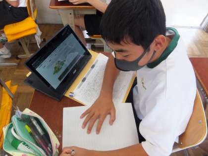 「レポートの組み立てを考えよう」の学習です。自分で考えたテーマについて、chrome book などを使って調べ、レポートにまとめています。