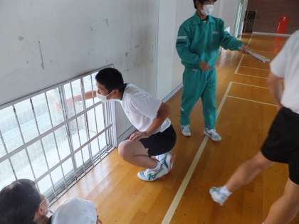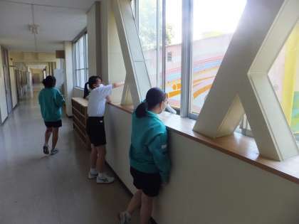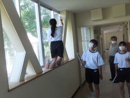 夏休みを前に学校をきれいにするために、整美委員主催の清掃ボランティアを行いました。今回は体育館やろうかにあるクモの巣の駆除です。新聞紙で窓枠にあるクモの巣を取り除きました。