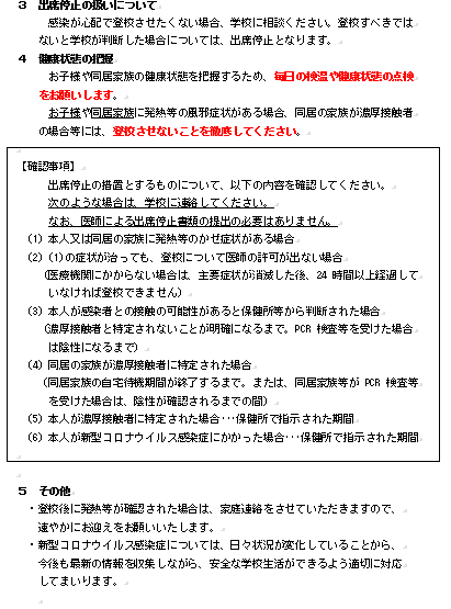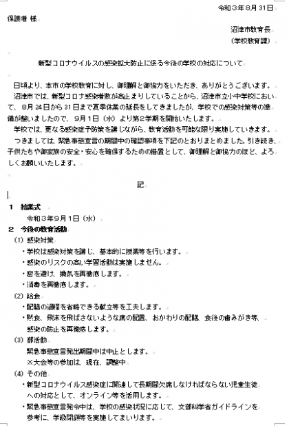 沼津市教育委員会事務局学校教育課からのお知らせ 公開日 2021/08/31 更新日 2021/08/31 学校紹介 保護者・生徒の皆様へ 上記の通り、学校教育課から連絡がありました。 内容を御確認いただき、感染防止にご理解とご協力をお願いいたします。 いいね(0)